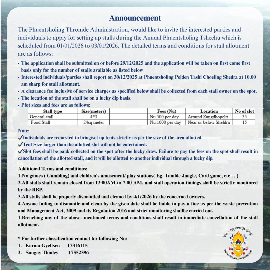 The Phuentsholing Thromde Administration, would like to invite the interested parties and individuals to apply for setting up stalls during the Annual Phuentsholing Tshechu which is scheduled from 01/01/2026 to 03/01/2026. The detailed terms and conditions for stall allotment are as follows: